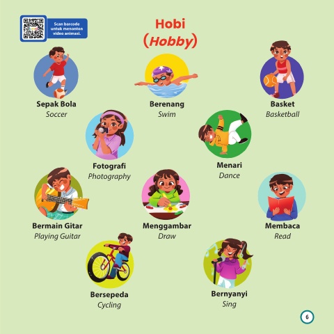 Scan barcode Hobi untuk menonton video animasi. (Hobby) Sepak Bola Berenang Basket Soccer Swim Basketball Fotografi Menari Photography Dance Bermain Gitar Menggambar Membaca Playing Guitar Draw Read Bersepeda Bernyanyi Cycling Sing 6