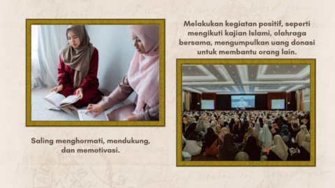 Melakukan kegiatan positif, seperti mengikuti kajian Islami, olahraga bersama, mengumpulkan uang donasi untuk membantu orang lain. Saling menghormati, mendukung, dan memotivasi.