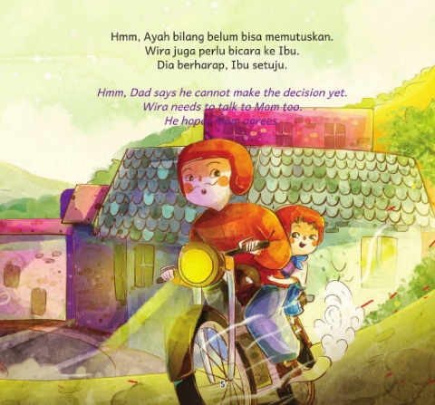 Hmm, Ayah bilang belum bisa memutuskan. Wira juga perlu bicara ke Ibu. Dia berharap, Ibu setuju. Hmm, Dad says he cannot make the decision yet. Wira needs to talk to Mom too. He hopes Mom agrees. 5 5