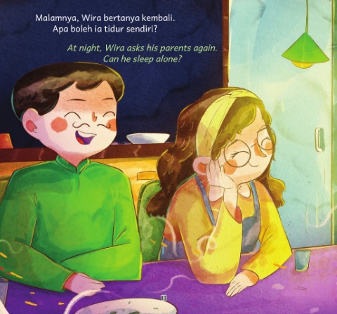 Malamnya, Wira bertanya kembali. Apa boleh ia tidur sendiri? At night, Wira asks his parents again. Can he sleep alone? 10 10