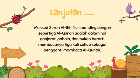Lanjutan ..... L a n j u t a n . . . . . Maksud Surah Al-Ikhlās sebanding dengan sepertiga Al-Qur’an adalah dalam hal ganjaran pahala, dan bukan berarti membacanya tiga kali cukup sebagai pengganti mambaca Al-Qur’an.