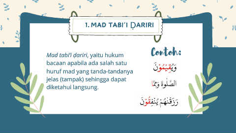 1. MAD TABI’I ḌARIRI Contoh: Mad tabi’i ḍariri, yaitu hukum bacaan apabila ada salah satu huruf mad yang tanda-tandanya jelas (tampak) sehingga dapat diketahui langsung.