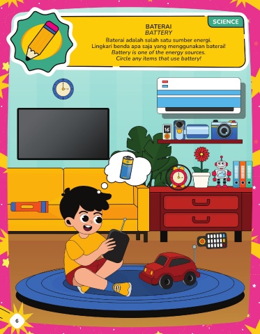 SCIENCE BATERAI BATTERY Baterai adalah salah satu sumber energi. Lingkari benda apa saja yang menggunakan baterai! Battery is one of the energy sources. Circle any items that use battery! 6 6