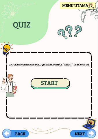 MENU UTAMA QUIZ UNTUK MENGERJAKAN SOAL QUIZ KLIK TOMBOL “ START “ DI BAWAH INI. START BACK NEXT