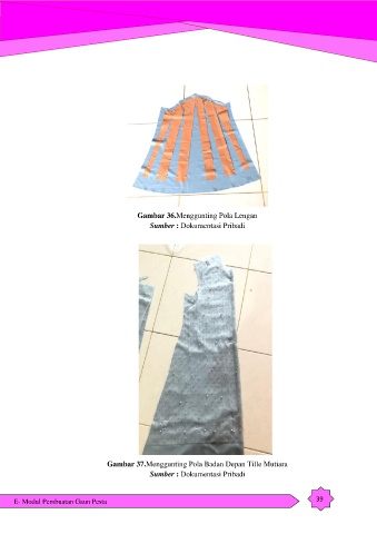 Gambar 36.Menggunting Pola Lengan Sumber : Dokumentasi Pribadi Gambar 37.Menggunting Pola Badan Depan Tille Mutiara Sumber : Dokumentasi Pribadi E- Modul Pembuatan Gaun Pesta 39