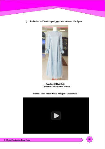 j. Setelah itu, beri hiasan seperti payet atau sulaman, lalu dipres. Gambar 69.Hasil Jadi Sumber: Dokumentasi Pribadi Berikut Link Video Proses Menjahit Gaun Pesta E- Modul Pembuatan Gaun Pesta 58