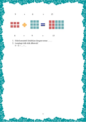 9 + 6 = 15 6 + 9 = 15 1. Sifat komutatif dituliskan dengan rumus …… 2. Lengkapi titik-titik dibawah! 9 + 6 = …+… 3