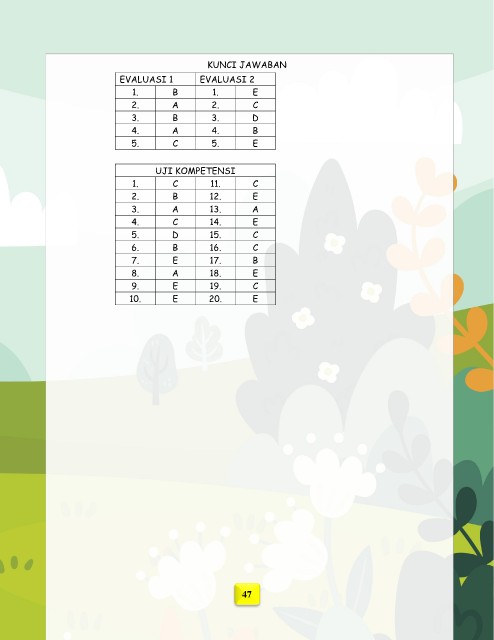 KUNCI JAWABAN EVALUASI 1 EVALUASI 2 1. B 1. E 2. A 2. C 3. B 3. D 4. A 4. B 5. C 5. E UJI KOMPETENSI 1. C 11. C 2. B 12. E 3. A 13. A 4. C 14. E 5. D 15. C 6. B 16. C 7. E 17. B 8. A 18. E 9. E 19. C 10. E 20. E 47