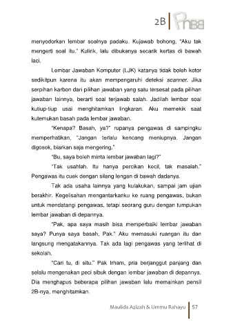 menyodorkan lembar soalnya padaku. Kujawab bohong, “Aku tak