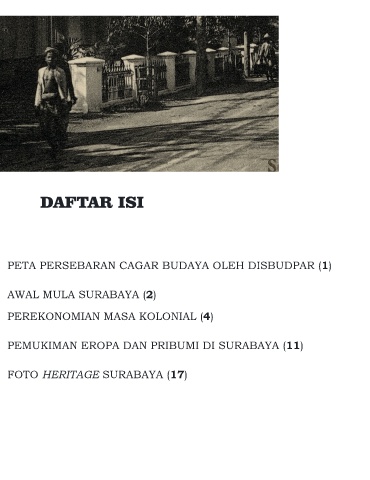 DAFTAR ISI PETA PERSEBARAN CAGAR BUDAYA OLEH DISBUDPAR (1) AWAL MULA SURABAYA (2) PEREKONOMIAN MASA KOLONIAL (4) PEMUKIMAN EROPA DAN PRIBUMI DI SURABAYA (11) FOTO HERITAGE SURABAYA (17)