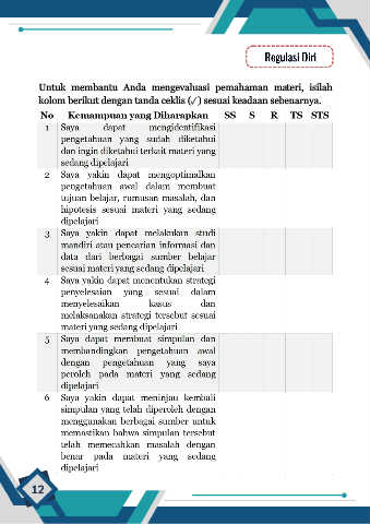 Untuk membantu Anda mengevaluasi pemahaman materi, isilah kolom berikut dengan tanda ceklis (✓) sesuai keadaan sebenarnya. 12