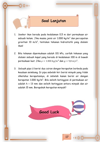 2. Bila tekanan dipermukaan adalah 101 kPa, carilah tekanan yang