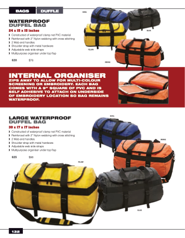 INTERNAL ORGANISER ZIPS AWAY TO ALLOW FOR MULTI-COLOUR SCREENING OR EMBROIDERY. EACH BAG COMES WITH A 9” SQUARE OF PVC AND IS SELF ADHESIVE TO ATTACH ON UNDERSIDE OF EMBROIDERY LOCATION SO BAG REMAINS WATERPROOF.