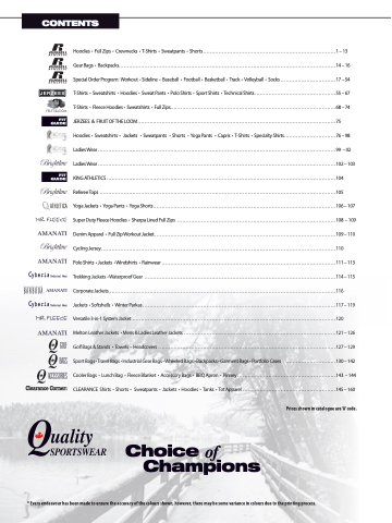 Hoodies • FullZips • Crewnecks • T-Shirts • Sweatpants • Shorts.............................................................................1–13 GearBags • Backpacks..............................................................................................................................14–16 SpecialOrderProgram: Workout •Sideline • Baseball • Football • Basketball • Track • Volleyball • Socks ................................17–54 T-Shirts • Sweatshirts • Hoodies • SweatPants • PoloShirts • SportShirts • TechnicalShirts...............................................55–67 T-Shirts • FleeceHoodies• Sweatshirts • FullZips................................................................................................68–74 JERZEES & FRUITOFTHELOOM...................................................................................................................75 Hoodies • Sweatshirts • Jackets • Sweatpants • Shorts • YogaPants • Capris • T-Shirts • SpecialtyShirts..............................76–98 LadiesWear..........................................................................................................................................99 –02 LadiesWear ..........................................................................................................................................102–103 KINGATHLETICS.....................................................................................................................................104 RefereeTops .........................................................................................................................................105 YogaJackets • YogaPants • YogaShorts..........................................................................................................106–107 SuperDutyFleeceHoodies • SherpaLinedFullZips ............................................................................................108 –109 DenimApparel • FullZipWorkoutJacket.........................................................................................................109–110 CyclingJersey........................................................................................................................................110 PoloShirts •Jackets •Windshirts • Rainwear .....................................................................................................111–113 TrekkingJackets •WaterproofGear ...............................................................................................................114–115 CorporateJackets....................................................................................................................................116 Jackets •Softshells • WinterParkas................................................................................................................117–119 Versatile3-in-1SystemJacket ......................................................................................................................120 MeltonLeatherJackets •Mens&LadiesLeatherJackets ........................................................................................121–126 GolfBags&Stands • Towels • Headcovers .......................................................................................................127–129 SportBags•TravelBags•IndustrialGearBags•WheeledBags•Backpacks•GarmentBags•PortfolioCases .............................130–142 CoolerBags • LunchBag • FleeceBlanket • AccessoryBags • BBQApron • Pinney.........................................................143 –144 CLEARANCE Shirts • Shorts • Sweatpants • Jackets • Hoodies • Tanks • TotApparel ......................................................145–160
