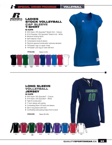 ❱ 94% Nylon / 6% Spandex® Stretch Knit – Colours ❱ 91% Polyester / 9% Spandex® Stretch knit – White ❱ Moisturewickingfabric