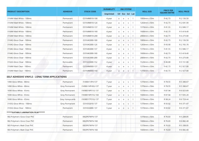 PRODUCT DESCRIPTION ADHESIVE STOCK CODE ROLL SIZE SQUARE METRE ROLL PRICE