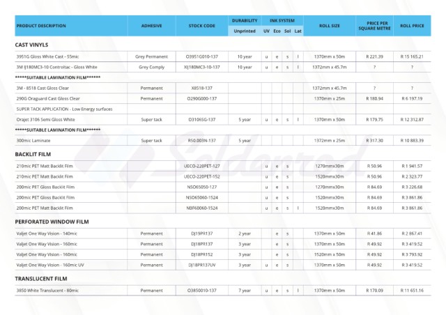 PRODUCT DESCRIPTION ADHESIVE STOCK CODE ROLL SIZE SQUARE METRE ROLL PRICE