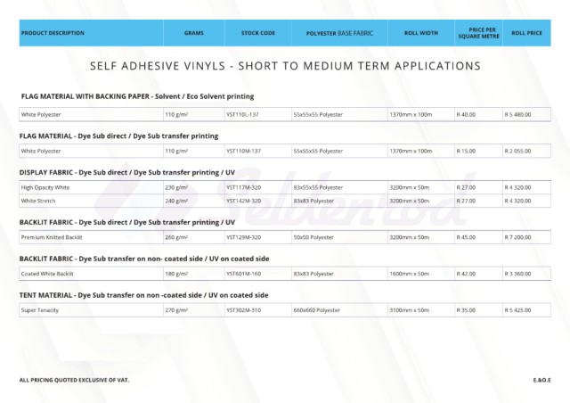 PRODUCT DESCRIPTION GRAMS STOCK CODE POLYESTER BASE FABRIC ROLL WIDTH SQUARE METRE ROLL PRICE