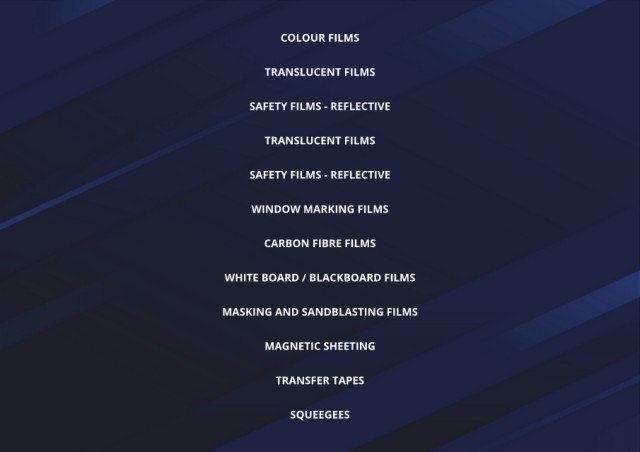 COLOUR FILMS TRANSLUCENT FILMS SAFETY FILMS - REFLECTIVE TRANSLUCENT FILMS SAFETY FILMS - REFLECTIVE WINDOW MARKING FILMS CARBON FIBRE FILMS WHITE BOARD / BLACKBOARD FILMS MASKING AND SANDBLASTING FILMS MAGNETIC SHEETING TRANSFER TAPES SQUEEGEES
