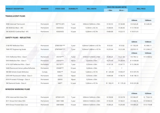 3100 PET Reflective Films Permanent QTM3100-*** 3 year 620mm/1240mm x 45.7m R 63.69 R 53.02 R 1 502.05 R 3 004.11
