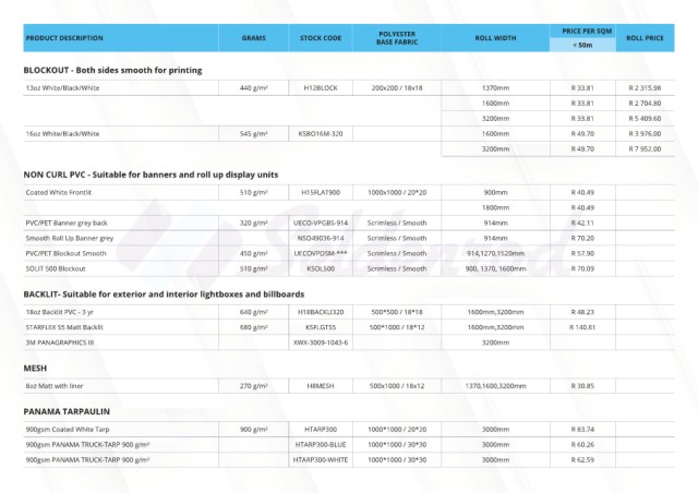 18oz Backlit PVC - 3 yr 640 g/m² H18BACKLI320 500*500 / 18*18 1600mm,3200mm R 48.23