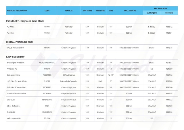 VALUE Printable HTV WPRINT Cotton / Polyester 140º Medium 10" 500/750/1000/1500mm E/S/LT R172.48