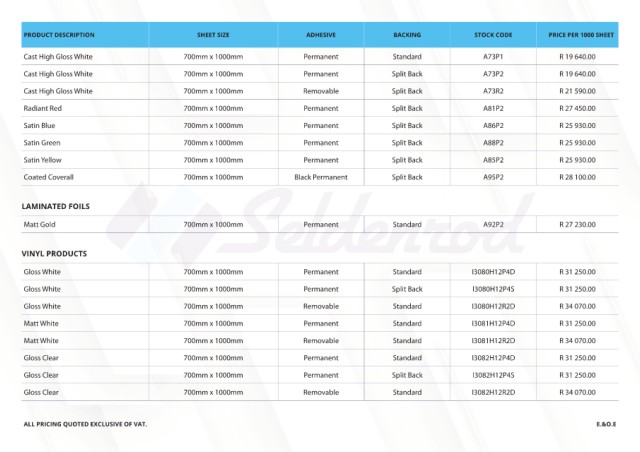 PRODUCT DESCRIPTION SHEET SIZE ADHESIVE BACKING STOCK CODE PRICE PER 1000 SHEET