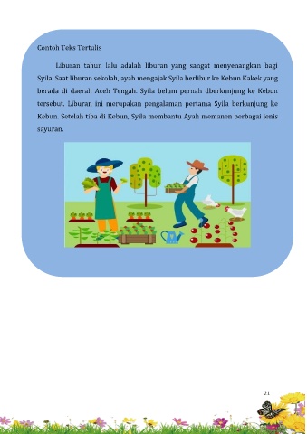 Syila. Saat liburan sekolah, ayah mengajak Syila berlibur ke Kebun Kakek yang