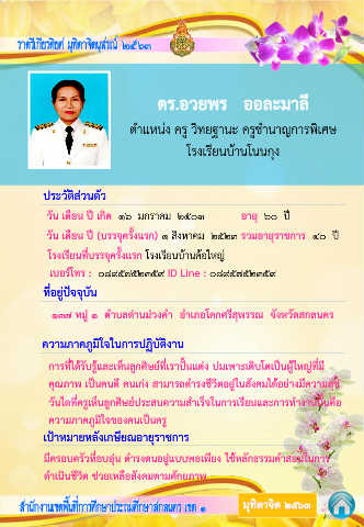 วัน เดือน ปี (บรรจุครั้งแรก) ๑ สิงหาคม ๒๕๒๓ รวมอายุราชการ ๔๐ ปี