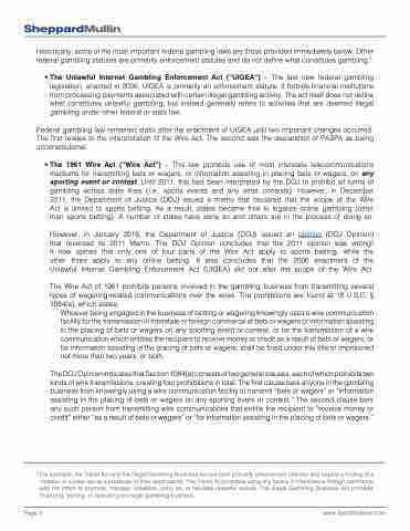 • The Unlawful Internet Gambling Enforcement Act (“UIGEA”) – The last new federal gambling legislation, enacted in 2006, UIGEA is primarily an enforcement statute. It forbids financial institutions from processing payments associated with certain illegal gambling activity. The act itself does not define what constitutes unlawful gambling, but instead generally refers to activities that are deemed illegal gambling under other federal or state law.