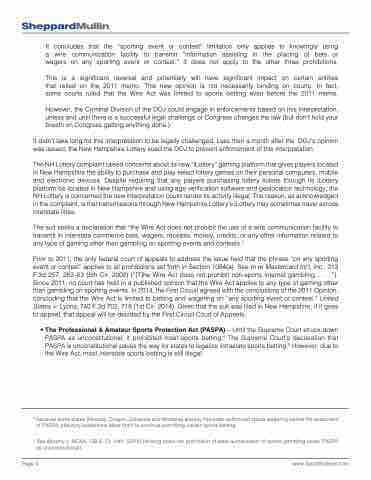 • The Professional & Amateur Sports Protection Act (PASPA) – Until the Supreme Court struck down PASPA as unconstitutional, it prohibited most sports betting.4 The Supreme Court’s declaration that PASPA is unconstitutional paves the way for states to legalize intrastate sports betting.5 However, due to the Wire Act, most interstate sports betting is still illegal.