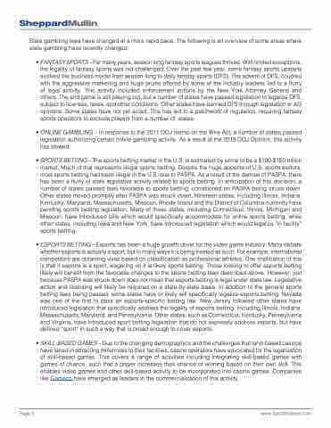 • FANTASY SPORTS – For many years, season long fantasy sports leagues thrived. With limited exceptions, the legality of fantasy sports was not challenged. Over the past few year, some fantasy sports upstarts evolved the business model from season-long to daily fantasy sports (DFS). The advent of DFS, coupled with the aggressive marketing and huge prizes offered by some of the industry leaders, led to a flurry of legal activity. This activity included enforcement actions by the New York Attorney General and others. The end game is still playing out, but a number of states have passed legislation to legalize DFS, subject to licenses, taxes, and other conditions. Other states have banned DFS through legislation or AG opinions. Some states have not yet acted. This has led to a patchwork of regulation, requiring fantasy sports operators to exclude players from a number of states.