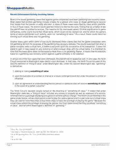The Ninth Circuit’s decision largely turned on the meaning of “something of value.”7 It stated that under Washington state law, a “thing of value” includes any money or property as well as extension of a service, entertainment or a privilege of playing at a game or scheme without charge.8 The Ninth Circuit held that in the game under review, virtual chips permit a user to play the casino games and if a user runs out of virtual chips they can wait for more free chips or buy more chips to have ‘the privilege of playing the game.9 Because the virtual chips extend the privilege of playing the games, the Court determined that they constitute “something of value” and fall within Washington’s definition of gambling.10
