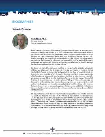 Ervin Staub is a Professor of Psychology Emeritus at the University of Massachusetts, Amherst, and Founding Director of its Ph.D. concentration in the Psychology of Peace and Violence. Dr. Staub was born in Hungary, where, as a young child he lived through Nazism, and then communism. He escaped from there when he was 18 years old, lived in Vienna for two years, and then came to the U.S. He finished his undergraduate education at the University of Minnesota and received his Ph.D. at Stanford. He taught at Harvard and was visiting professor at Stanford, the University of Hawaii, and the London School of Economic and Political Science.