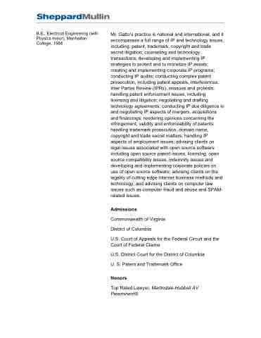 Mr. Gatto's practice is national and international, and it encompasses a full range of IP and technology issues, including: patent, trademark, copyright and trade secret litigation; counseling and technology transactions; developing and implementing IP strategies to protect and to monetize IP assets; creating and implementing corporate IP programs; conducting IP audits; conducting complex patent prosecution, including patent appeals, interferences, Inter Partes Review (IPRs), reissues and protests; handling patent enforcement issues, including licensing and litigation; negotiating and drafting technology agreements; conducting IP due diligence in and negotiating IP aspects of mergers, acquisitions and financings; rendering opinions concerning the infringement, validity and enforceability of patents; handling trademark prosecution, domain name, copyright and trade secret matters; handling IP aspects of employment issues; advising clients on legal issues associated with open source software including open source patent issues, licensing, open source compatibility issues, indemnity issues and developing and implementing corporate policies on use of open source software; advising clients on the legality of cutting edge Internet business methods and technology; and advising clients on computer law issues such as computer fraud and abuse and SPAM- related issues.