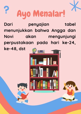 Ayo Menalar! Dari penyajian tabel menunjukkan bahwa Angga dan Novi akan mengunjungi perpustakaan pada hari ke-24, ke-48, dst
