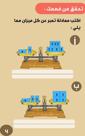 تحقق من فهمك : اكتب معادلة تعبر عن كل ميزان مما يلي : 1 1 1أ X 1 11 1 1 X 11 ب 11 11 4
