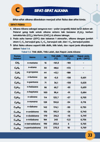 3. Sifat fisika alkana seperti titik didih, titik leleh, dan rapat jenis ditunjukkan