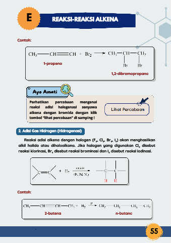 Reaksi adisi alkena dengan halogen (F₂, Cl₂, Br₂, I₂) akan menghasilkan