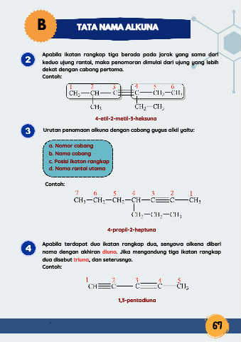 Urutan penamaan alkuna dengan cabang gugus alkil yaitu: