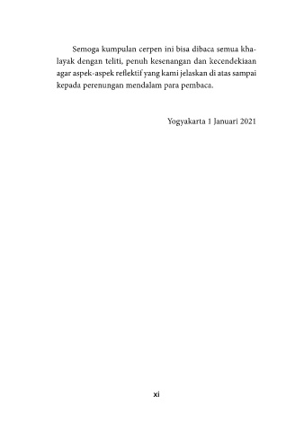 Semoga kumpulan cerpen ini bisa dibaca semua kha- layak dengan teliti, penuh kesenangan dan kecendekiaan agar aspek-aspek reflektif yang kami jelaskan di atas sampai kepada perenungan mendalam para pembaca. Yogyakarta 1 Januari 2021 xi