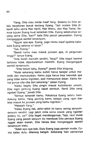 yang sama Dita, 'kan?" kata Dita penuh penyesaian. Eyang