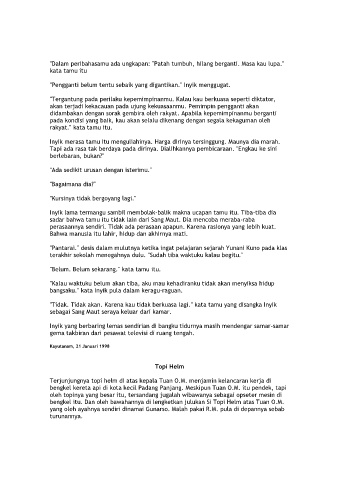 Tapi ada rasa tak berdaya pada dirinya. Dialihkannya pembicaraan. "Engkau ke sini