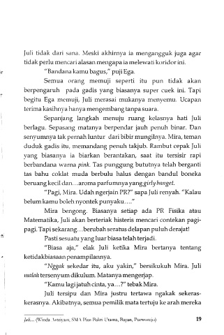 "Pagi, Mira. Udah ngerjain PR?" sapa Juli renyah. "Kalau