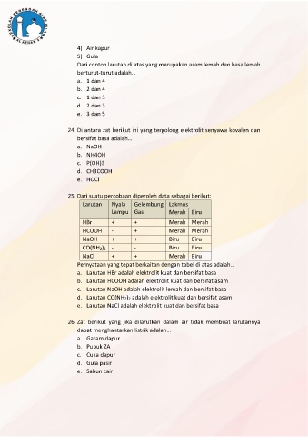 24. Di antara zat berikut ini yang tergolong elektrolit senyawa kovalen dan