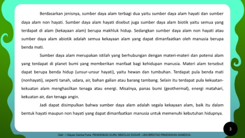 Berdasarkan jenisnya, sumber daya alam terbagi dua yaitu sumber daya alam hayati dan sumber