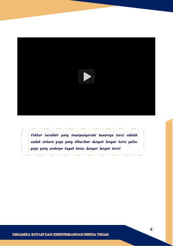 Faktor terakhir yang mempengaruhi besarnya torsi adalah sudut antara gaya yang diberikan dengan lengan torsi yaitu gaya yang arahnya tegak lurus dengan lengan torsi. 6 DINAMIKA ROTASI DAN KESETIMBANGAN BENDA TEGAR
