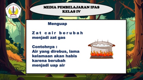 MEDIA PEMBELAJARAN IPAS KELAS IV Menguap Z a t c a i r b e r u b a h menjadi zat gas Contohnya : Air yang direbus, lama kelamaan akan habis karena berubah menjadi uap air