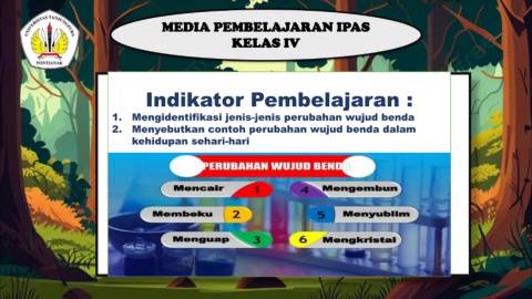 MEDIA PEMBELAJARAN IPAS KELAS IV Indikator Pembelajaran : 1. Mengidentifikasi jenis-jenis perubahan wujud benda 2. Menyebutkan contoh perubahan wujud benda dalam kehidupan sehari-hari