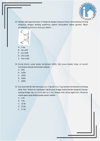 22. Sebuah atom gas bermassa m bergerak dengan kelajuan tetap v bertumbukan lenting